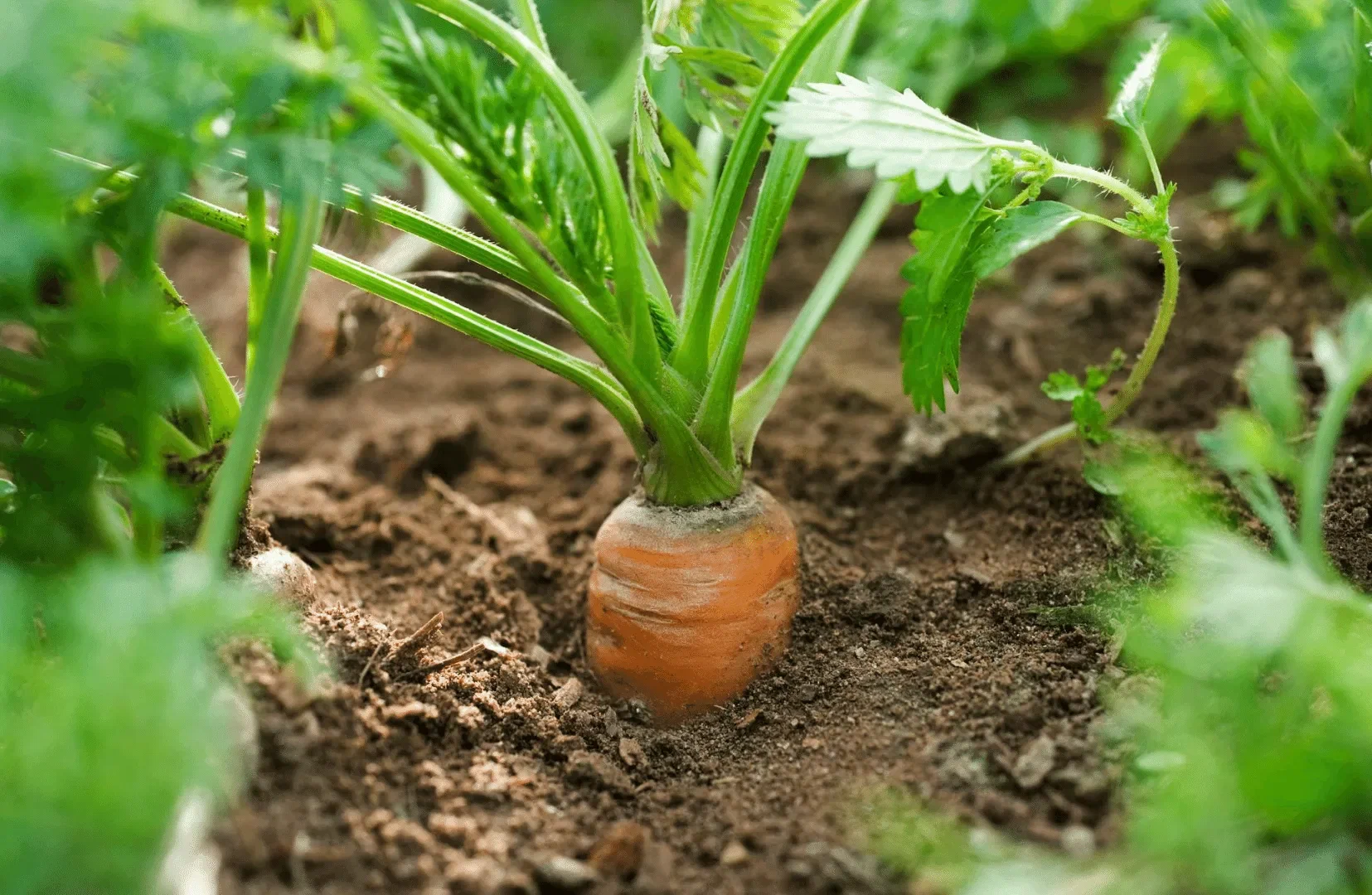 - Верхушка: верхняя часть моркови немного выступает из почвы или находится на уровне грунта, и корнеплод выглядит крупным и плотным.